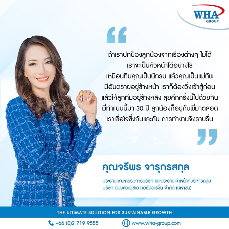 คุณจรีพร จารุกรสกุล ประธานคณะกรรมการบริหาร และประธานเจ้าหน้าที่บริหารกลุ่ม บริษัท ดับบลิวเอชเอ คอร์ปอเรชั่น จำกัด (มหาชน)