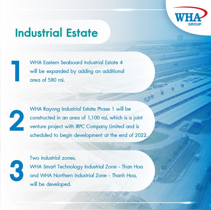 - WHA Industrial Estate Rayong Phase 1 will be constructed in an area of 1,100 rai, which is a joint venture project with IRPC Company Limited and is scheduled to begin development at the end of 2022.