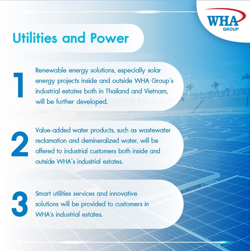 - Renewable energy solutions, especially solar energy projects inside and outside WHA Group’s industrial estates both in Thailand and Vietnam, will be further developed.