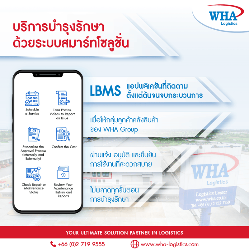 Logistics and Building Maintenance (LBMS) แอปพลิเคชันตอบโจทย์ความต้องการตั้งแต่ต้นจนจบกระบวนการ ให้กลุ่มลูกค้าคลังสินค้าของ WHA Group สามารถติดตามการทำงานทุกขั้นตอน ผ่านการแจ้ง อนุมัติ และยืนยันการใช้งานที่สะดวกสบาย