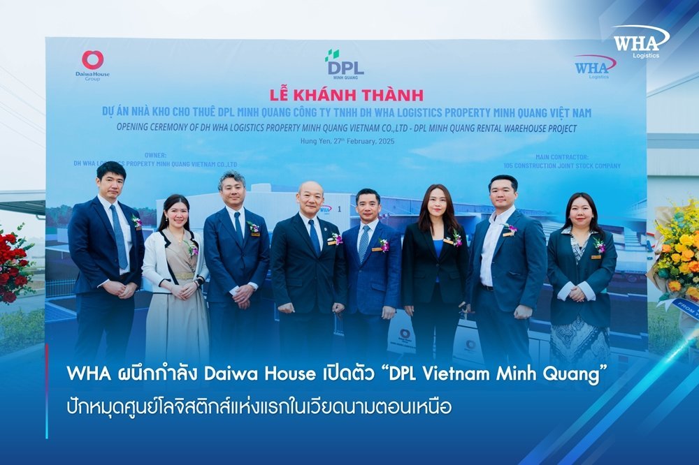 บริษัท ดับบลิวเอชเอ คอร์ปอเรชั่น จำกัด (มหาชน) (“WHA”) จับมือ บริษัท ไดวะ เฮ้าส์ อินดัสทรี จำกัด (“Daiwa House”) เปิดศูนย์โลจิสติกส์ดีพีแอลเวียดนามมินห์กวาง (DPL Vietnam Minh Quang) อย่างเป็นทางการ บนพื้นที่โครงการ 70,109 ตร.ม. โดยมีพื้นที่ให้เช่ารวม 37,500 ตร.ม. ในวันที่ 27 กุมภาพันธ์ 2568 ภายในนิคมอุตสาหกรรมมินห์กวาง จังหวัด ฮึงเอียน (ห่างจากกรุงฮานอยไปทางทิศตะวันออกราว 40 กิโลเมตร) ประเทศเวียดนาม